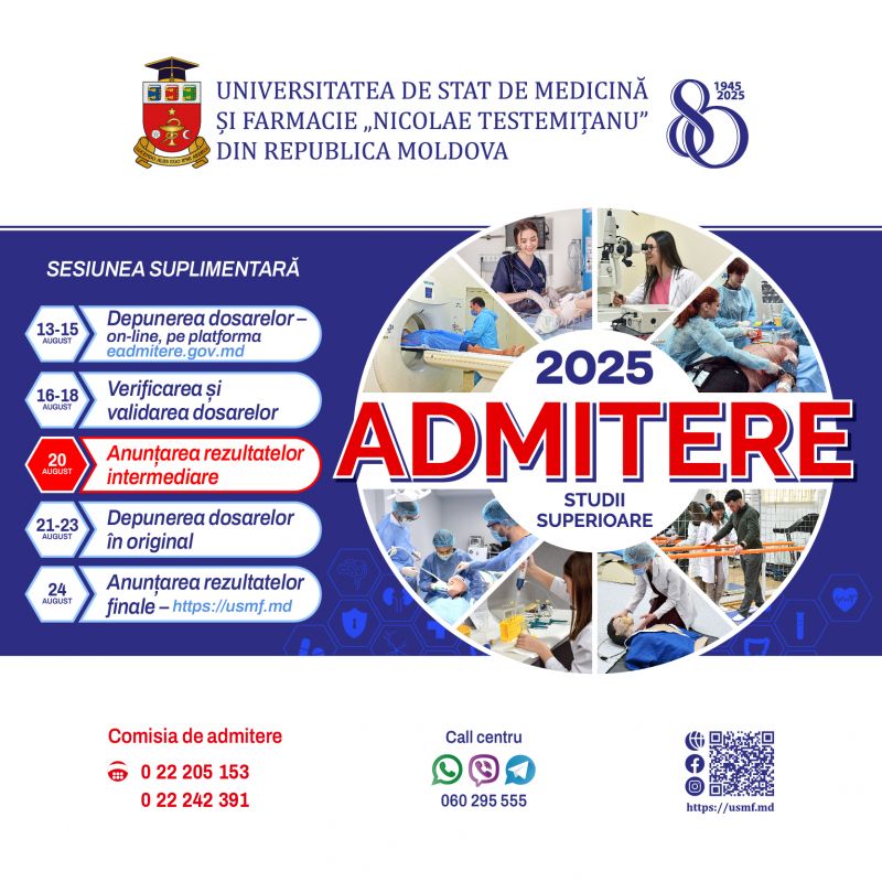 Astăzi, 20 august 2025, Universitatea de Stat de Medicină și Farmacie „Nicolae Testemițanu” a făcut publice rezultatele intermediare ale sesiunii suplimentare de admitere la studii superioare de licență și integrate, precum și cele de master. La sesiunea suplimentară de admitere au fost înscriși în concurs 164 de tineri, inclusiv 156 candidați la studii de licență și integrate și 8 candidați la studii de master.